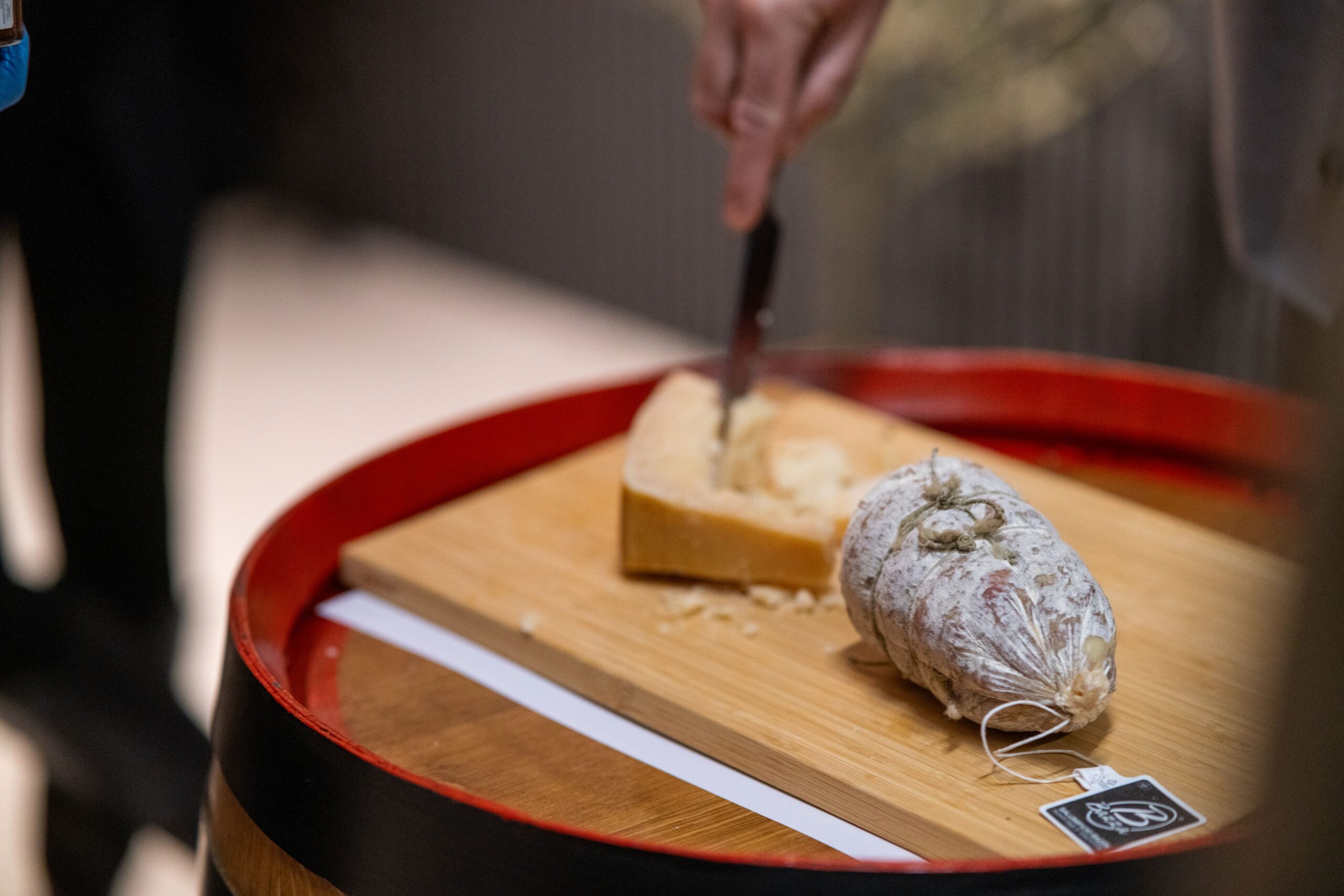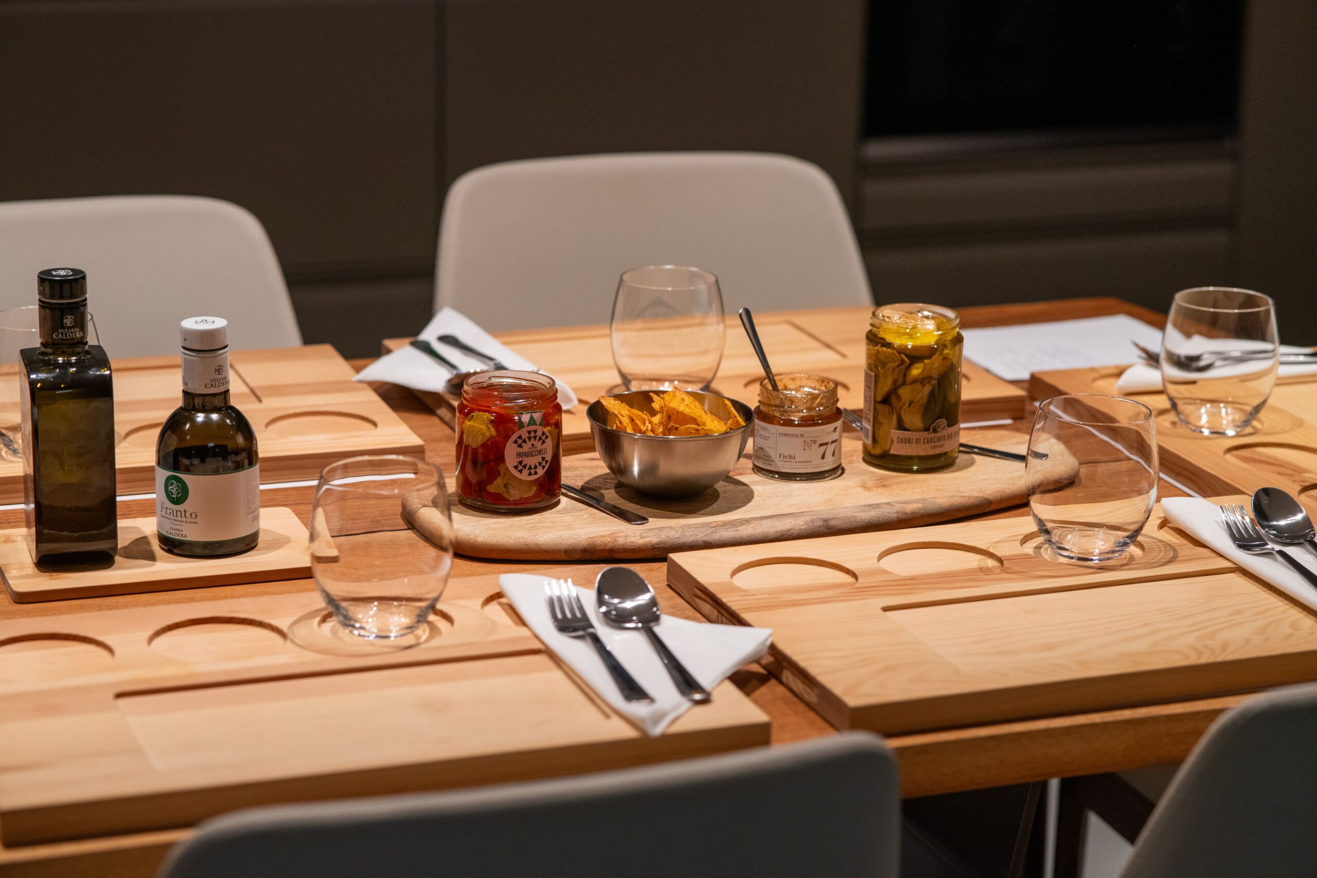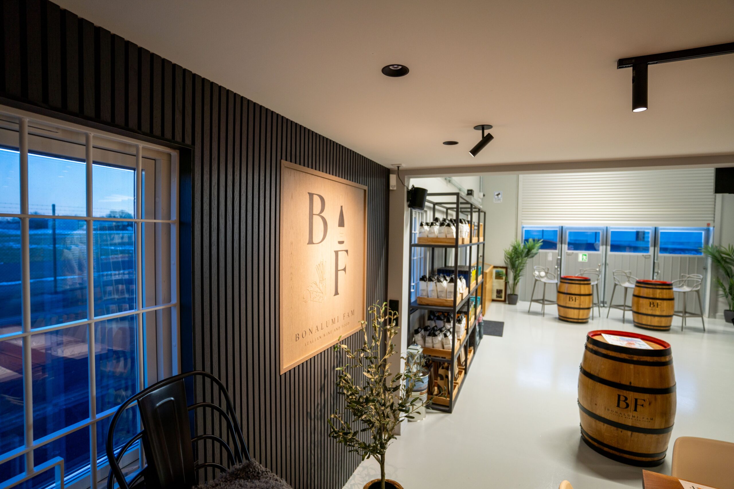 Thomas bestämde sig direkt för att ta bort skiljeväggen mellan de två lokalerna och skapa en öppen planlösning. Idag rymmer lokalen såväl visningshyllor för produkterna som matbord för provsmakningar och ett visningskök där kunderna kan provlaga maträtter med företagets produkter. Här kan nu Thomas med sin sambo och affärspartner Ilaria Accordini ta emot grupper på upp till 10-12 personer.