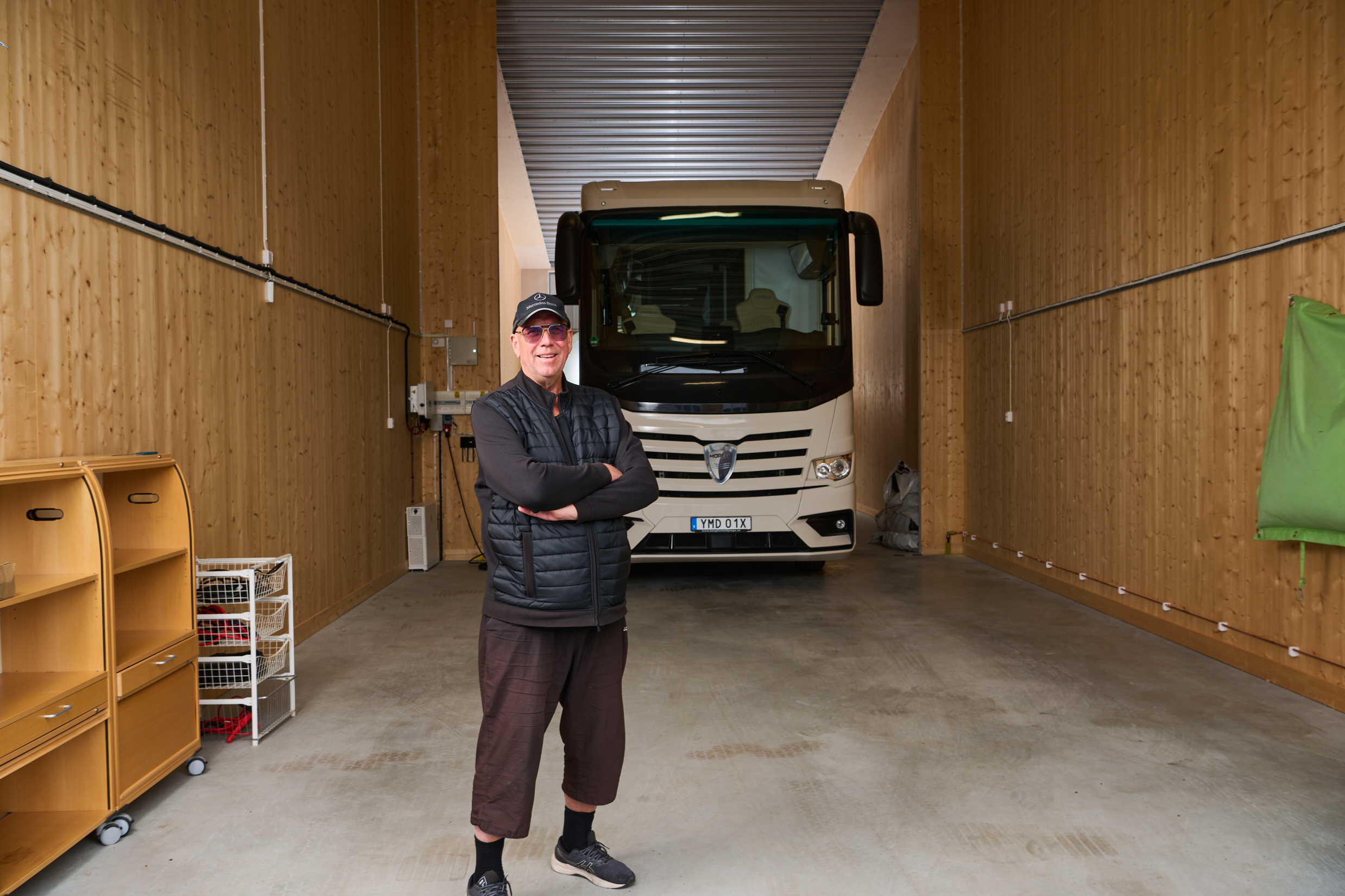 Lokalen rymmer idag familjens husbil och två personbilar. Med luftvärmepumpen hålls temperaturen kring 15 grader även vintertid, vilket gör att fordonen slipper stå utomhus i kyla och fukt. På taket sitter också solceller som bidrar till en lägre energikostnad.